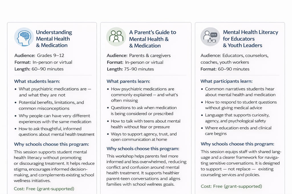 UnScripted provides age-appropriate workshops that help students and parents understand mental health, medication, and informed decision-making.